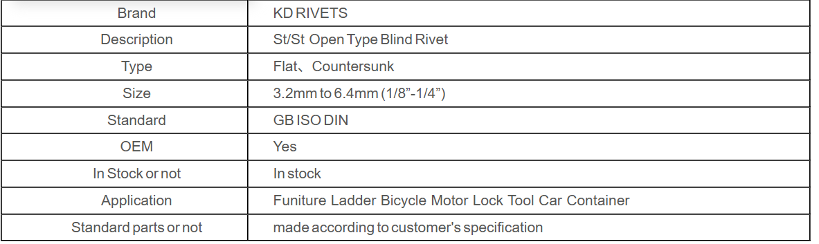 Ang ST/ST Open Type Blind Rivet ay isang mataas na pagganap na fastener na itinayo nang buo mula sa hindi kinakalawang na asero, na nag-aalok ng pambihirang paglaban ng kaagnasan at tibay para sa hinihingi na mga aplikasyon. Idinisenyo para sa isang panig na pag-install, nagbibigay ito ng maaasahang pangkabit sa malupit o kinakaing unti-unting mga kapaligiran kung saan maaaring mabigo ang iba pang mga rivets.