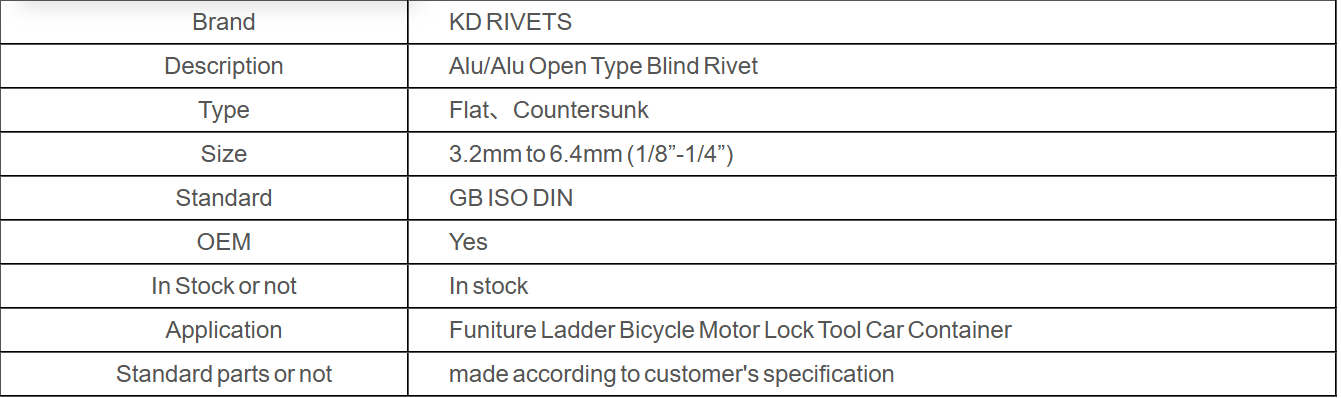 Alu/Alu 개방형 블라인드 리벳은 알루미늄 몸체와 알루미늄 맨드릴을 특징으로 하는 다용도 패스너로, 우수한 내식성과 경량 성능을 위해 전체 알루미늄 구조를 제공합니다. 작업물의 한 면에만 접근할 수 있는 빠른 설치를 위해 설계되었으며 비구조적 및 가벼운 작업에 고정하는 데 이상적입니다.